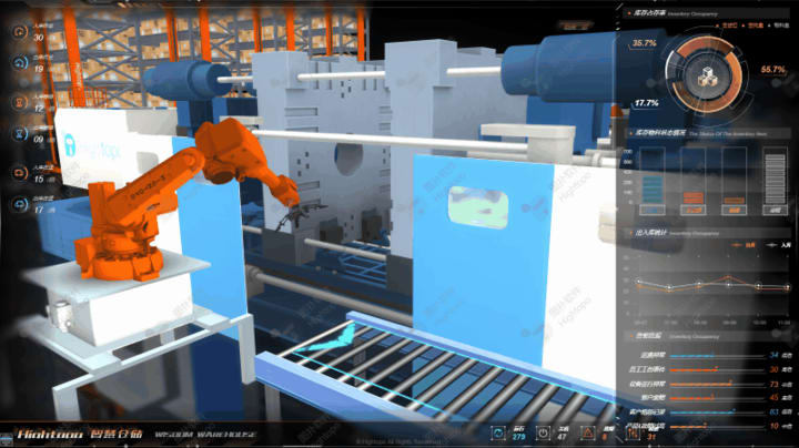 The palletizing robot completes various rotations, movements or compound actions through the mechanical arm to achieve prescribed actions and change the position and posture of the grasped objects. In this demo, we can see how HT’s powerful rendering engine achieve precise control of the entire palletizing robot operation process, and highly simulate the swing process of the robot arm.