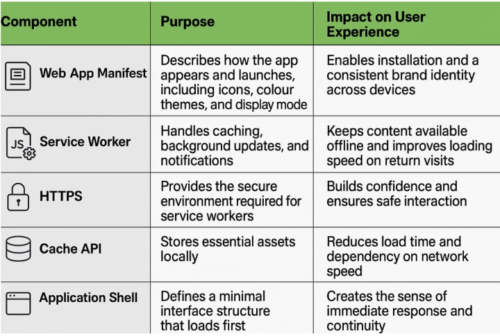 Mozilla’s MDN defines PWAs as web apps that use progressive enhancement to match the quality of native software. In practice, that means they load fast, adapt across devices, and stay reliable even on poor connections.
