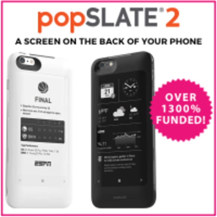 The item was popSlate 2. It was a case made with e-ink capability, and it promised a second screen for your phone. Early backers could contribute $69 and beat the $99 standard price. They hit their funding goal immediately, and it seemed to be a foregone conclusion we would have this item by the estimated delivery date of July 2016.