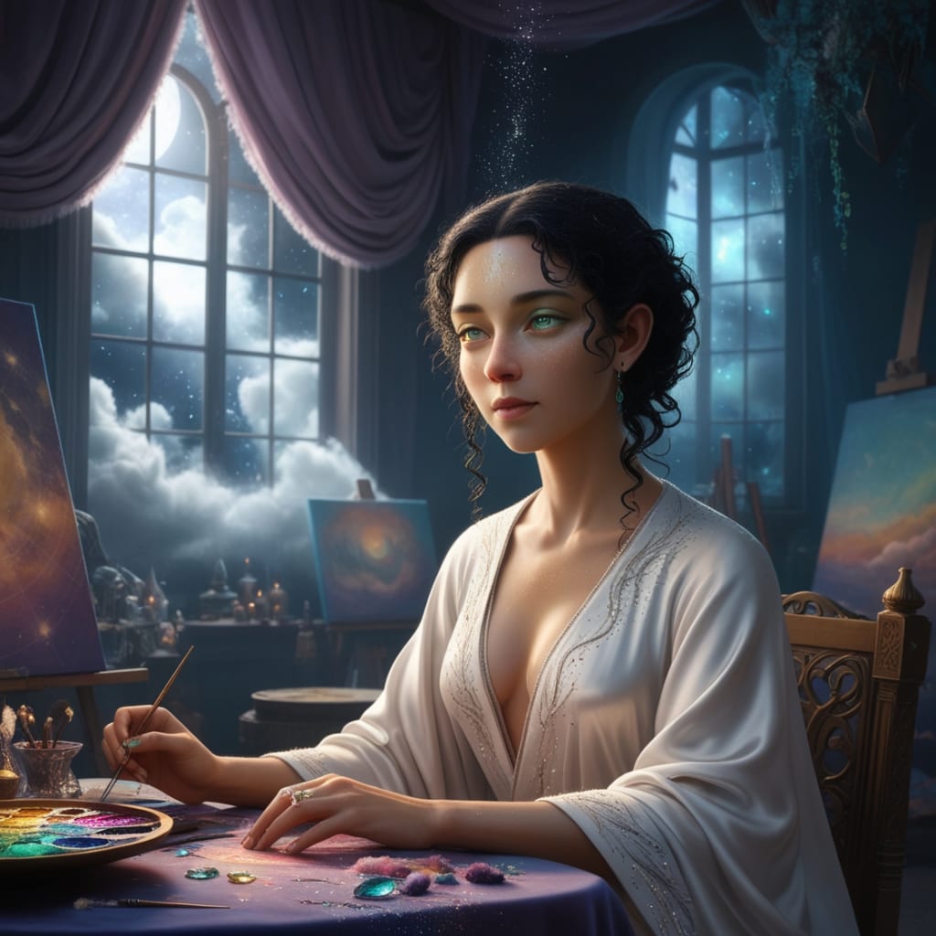 Elara’s studio was a magical place filled with color and light. The walls were adorned with her paintings—lush landscapes, fantastical creatures, and swirling galaxies that seemed to pulse with energy. Despite her talent, Elara often felt a deep sense of loneliness. She poured her heart into her art, but her creations were her only companions.