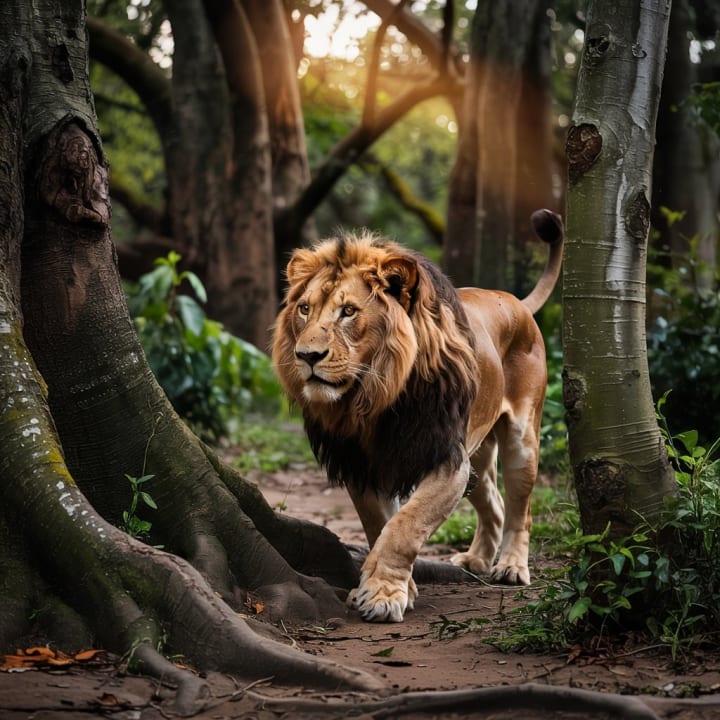 Now, among the creatures of the forest, there was one who had set his greedy eyes upon them — a fierce and cunning lion named Sheru. Sheru was a powerful beast, feared by all. Yet even he hesitated when it came to the four bulls, for he knew he could never defeat them if they stood united. He prowled the edges of the meadows, watching them from afar, his hunger growing each day. Still, he dared not attack.