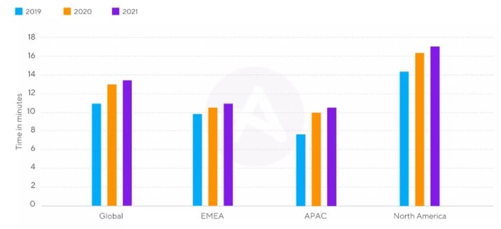 With app installs and sessions growing at an unprecedented pace, the average session length has also increased consistently in all the regions. Where on one hand in 2019, the global average session length was 11.03 minutes, it increased considerably to 12.85 minutes in the year 2020. As of the last recorded data, it had already climbed to 13.59 minutes while the year 2021 was still not over. APAC's average session length has grown the most, with 9.74 minutes in 2019, 12.05 in 2020, and 12.69 in 2021. EMEA also posted substantial boosts, with 9.93 minutes in 2019, 10.45 minutes in 2020, and 11.3 minutes in 2021.