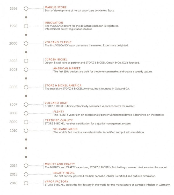 Jürgen Bickel, a longtime friend of Storz, acquired his first Volcano in the same cellar where it had been invented. Bickel was a German civil engineer working in Peru, who specialized in potable water supply and treatment. Bickel preferred vaporization to smoking the local hash cigarettes, and managed to bring along Storz's invention for personal use over his five-year stay in the Andes. Having found a kindred spirit in each other, the two entrepreneurs made the partnership official in 2002, and Storz & Bickel was born.