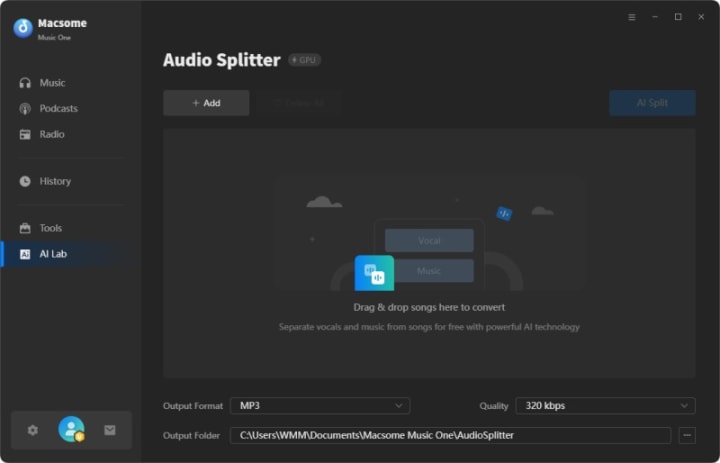Macsome’s AI Audio Splitter, a free module within the Macsome Music One, is a standout choice for vocal removal. This tool uses advanced AI algorithms to accurately separate vocals and instrumentals from songs and other audio files.