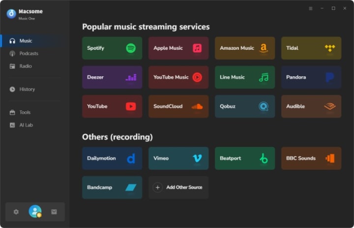 With Macsome Music One, you can download song from various streaming sites, such as Spotify, YouTube, YouTube Music, Apple Music, SoundCloud, Qobuz, and more.