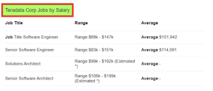 Teradata works for over 100 businesses in 75 countries, and some of its biggest customers include market leaders such as Ticketmaster and Verizon. The salaries of Teradata of employees are the following
