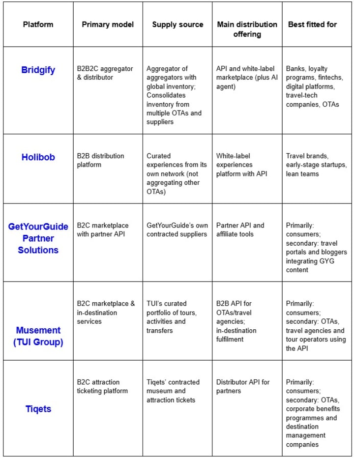 Travel brands, financial institutions and loyalty programmes wanting to offer bookable tours and experiences now have mature options beyond building their own supplier networks. Bridgify stands out for enterprises that require both supply aggregation and distribution enablement. Holibob caters to startups and mid‑size travel brands seeking personalised curation. The other 3 B2C platforms we listed also offer an API solution; the GetYourGuide Partner Solutions provides access to a consumer marketplace with automatic updates and simple affiliate tools, while Musement offers a curated mix of experiences, transfers and multi‑day tours backed by in‑destination teams. Tiqets specialises in attraction tickets and museum passes, with a developer‑friendly API and high‑quality content.