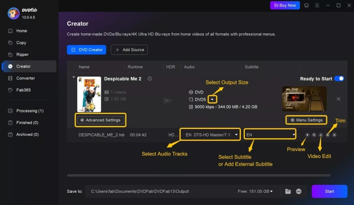 DVDFab DVD Creator is an easy-to-use MP4 to DVD converter that allows you to burn videos to standard DVD format and save them as a DVD folder or ISO file on your hard drive. It's not limited to MP4 files; it supports over 200 video formats, including MKV, AVI, MOV, and more as source files. The software supports both DVD-9 and DVD-5 output, with options for compression or maintaining the original quality. My favorite feature is the extensive customization options it provides. You can add external subtitles and choose from various preset menu templates to customize the appearance of your DVD menus, including text size, colors, background images, and more. The diverse menu styles ensure that your MP4 burns come with attractive and user-friendly menu navigation.