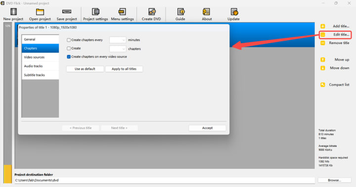 💡Tips: After highlighting a certain title, you can click the "Edit title..." button to open the properties of the title, where you can set the aspect ratio of the target, create chapters to your liking, add external subtitles as well as add audio tracks.