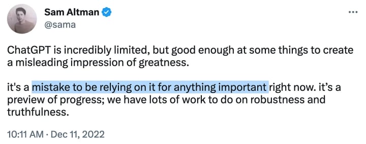 This comment is not mine. It is from a tweet by Sam Altman, CEO of OpenAI (the company behind ChatGPT):