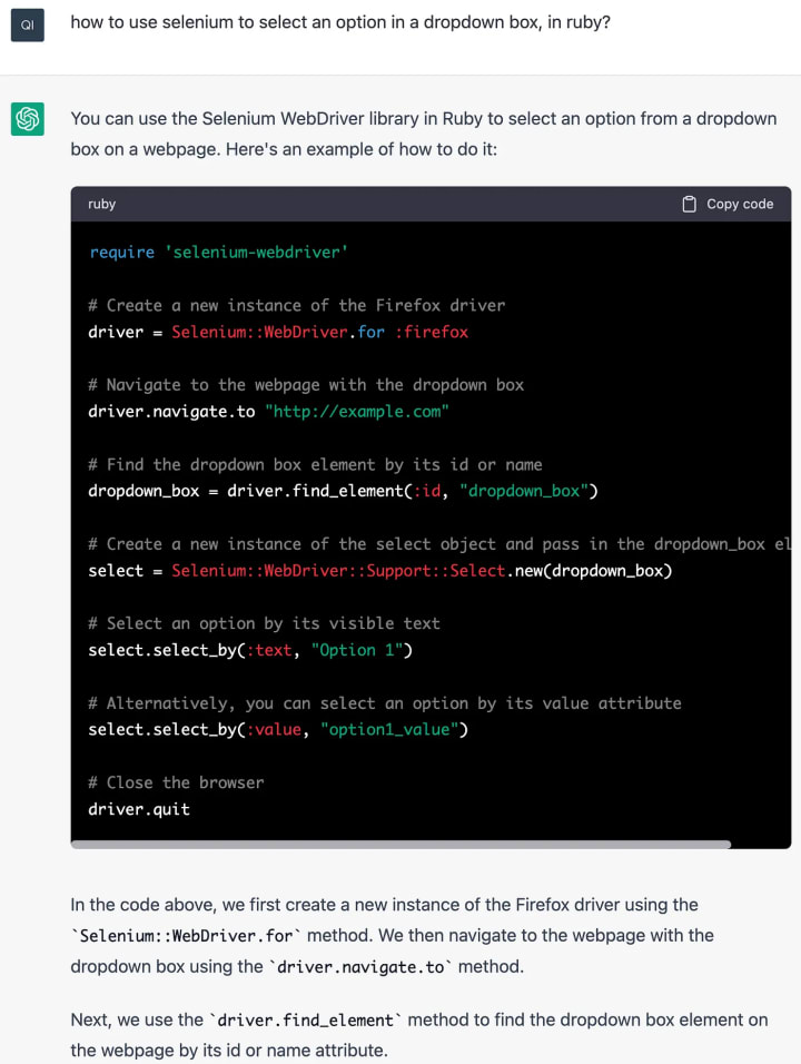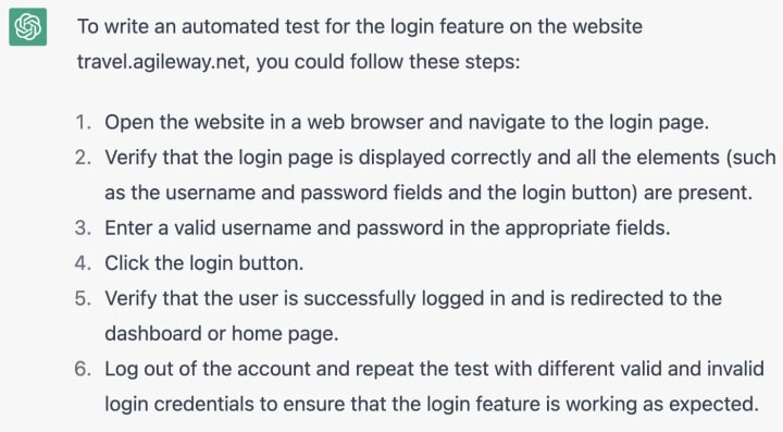 As you can see, ChatGPT is useless for creating a valid test script (often, invalid ones will consume more time). chatGPT might help answer a specific question, like the example below.