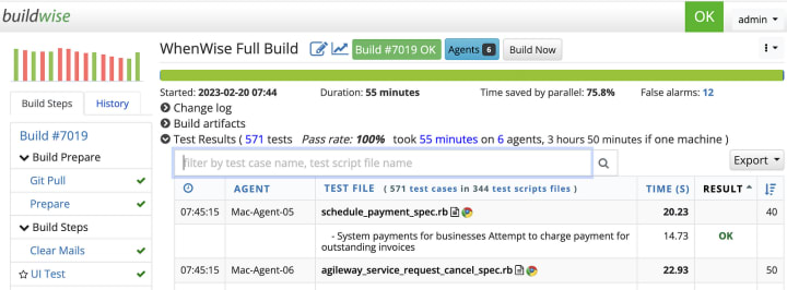 Below is a recent run of my WhenWise app's regression suite, consisting of 571 raw Selenium WebDriver tests.