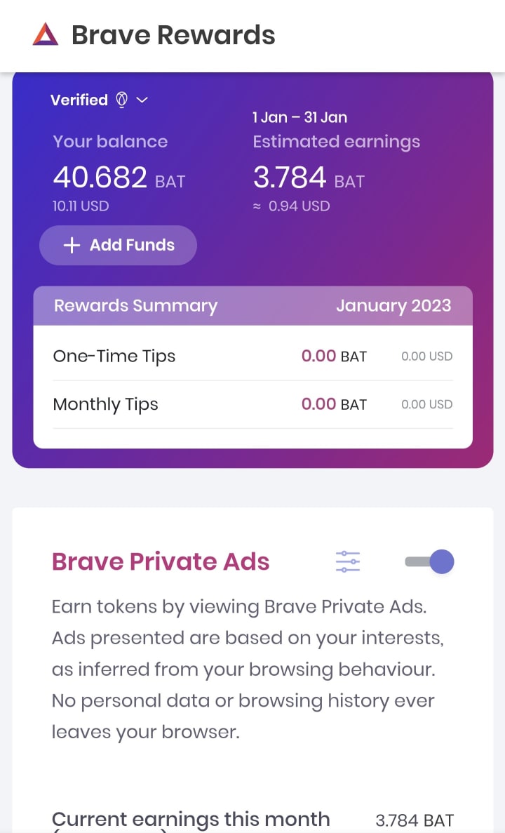 The browser blocks unwanted ads and trackers by default, which helps to speed up page loads and increase privacy. In addition to this, the browser has a built-in feature called Brave Rewards, which allows users to earn Basic Attention Token (BAT) for viewing ads. Users can choose to view ads on a regular basis and earn BAT, which can be used to support their favorite websites and content creators.