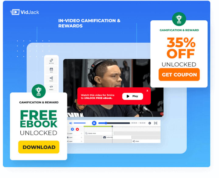 You will be able to have users unlock coupons, discounts, freebies etc… from right inside your video when they complete pre-defined actions. E.g Watch This Video For 2 Mins To Unlock A ‘Free Ebook’.