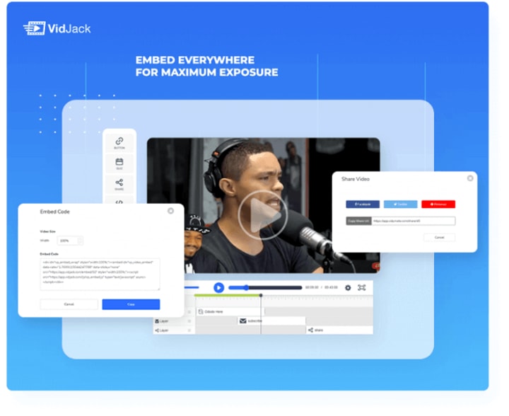 VidJack allows you to embed your interactive videos anywhere sales page, blogging platforms, site builders, e-commerce stores or share on social media and email.