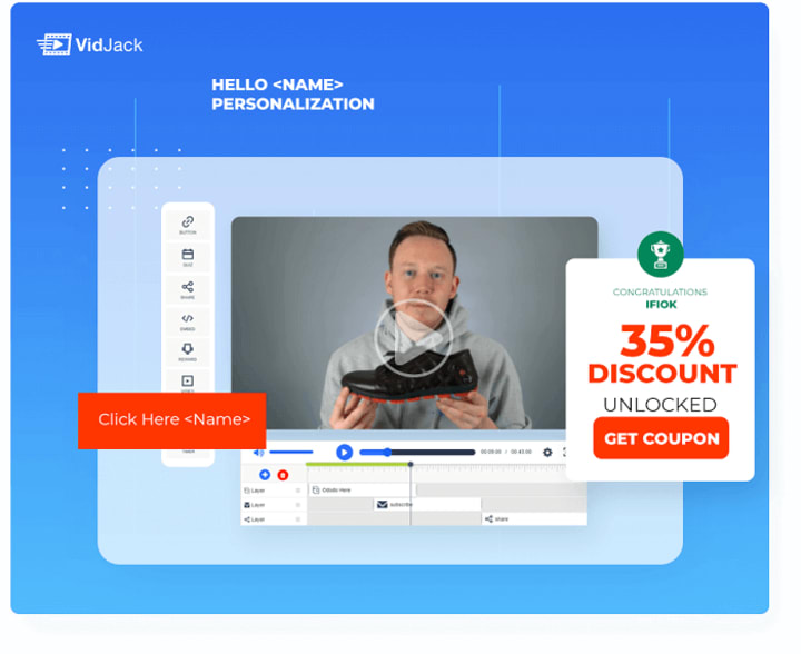 Inside this VidJack, it will help you to boost your engagement, leads and sales with personalization right inside any video using personalized text. For instance, Click Here <Name>
