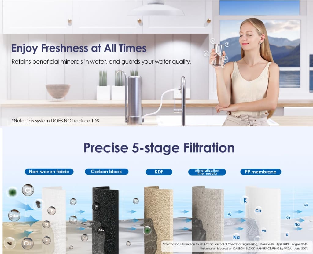 While many countertop filters on the market use only 1 to 3 stages of basic carbon filtration and often rely on manual filling via small water tanks, Waterdrop WD-CTF-01 distinguishes itself with its advanced 5-stage filtration that effectively removes chlorine, heavy metals, and impurities.