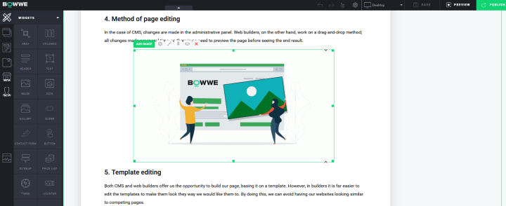 In the case of CMS systems, we make changes in the administration panel. When it comes to website builders, the available editor works based on a drag & drop system. We see the changes right away. We don't have to turn on the page preview to see how the effects of our work look on the website.