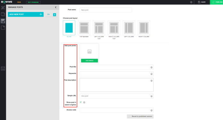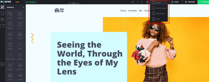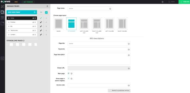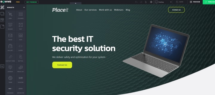 Tool: The website editor comes with a clean interface that makes it easy to design your website. You can create your own website by editing the available templates. You can also preview how the website will look on different devices and additionally adapt the website to mobile devices (phones, tablets) in the BOWWE mobile website editor. For more advanced users, BOWWE allows building a website from scratch without templates.