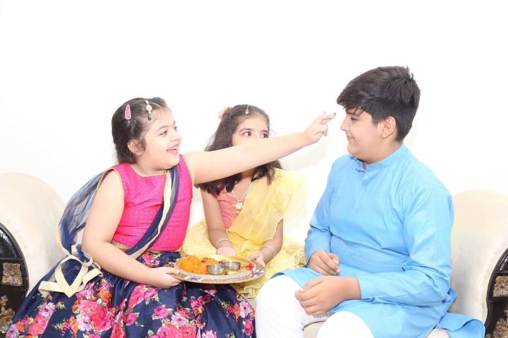 Sister’s Offering: Sisters lovingly present Jaggery, betel leaf, black grams, betel nut, and fruits to their brothers before performing the Aarti. In some parts of India, even a coconut is offered by the sister to their brothers as well.