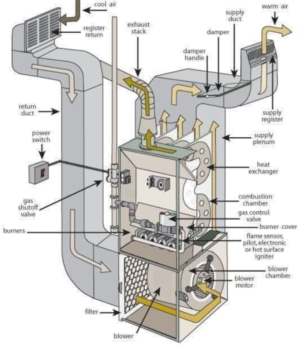 Once the air has been filtered, it is taken into the combustion chamber. This is when the heat begins. A gas control valve also controls the gas burners in the combustion chamber. When the termostat signals the furnace to produce heat, a valve opens and release natural gas via the burners, and then the heat produced is fed into the home through a system of ducts.These burners ignite and flames develop as they provide heat.
