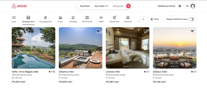 Airbnb interface displaying property listings with well-spaced elements for easy navigation and user focus.