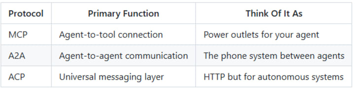 MCP equips your agent with tools. A2A lets agents collaborate on complex tasks. ACP provides the underlying communication fabric.