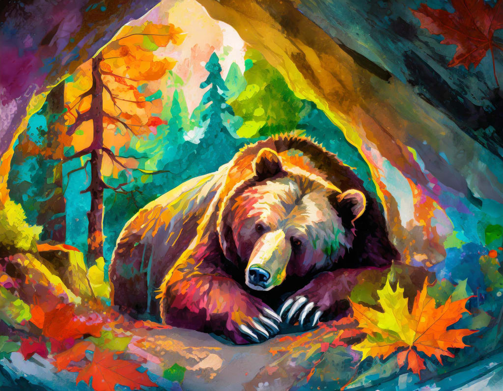 In the heart of the autumn forest, where the leaves were painted in hues of golden yellow and fiery red, a lonely grizzly bear named Theodore found solace in his cozy cave. The air was crisp with the promise of winter's approach, and Theodore knew it was time to settle in for his long winter's nap.