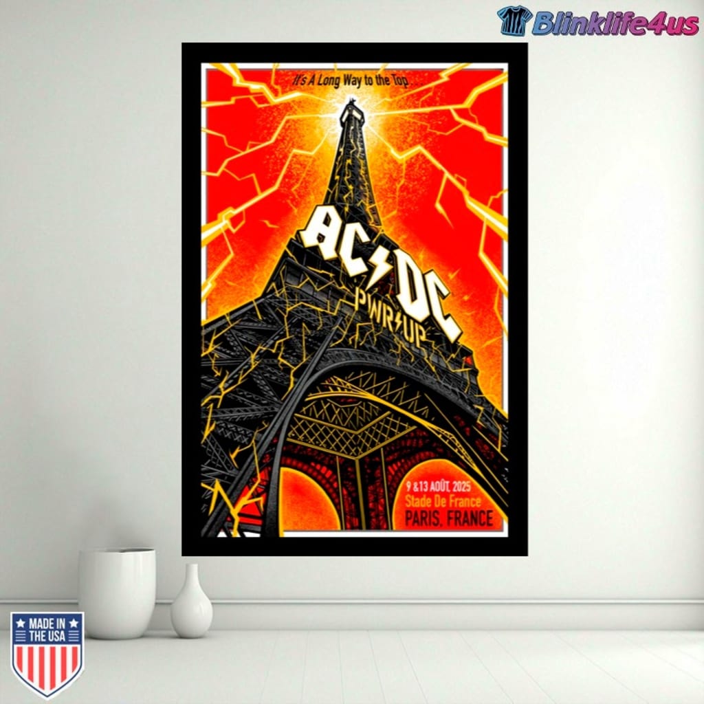 The AC/DC “Stade de France Paris 2025” poster is more than just a concert keepsake—it’s a bold work of art that fuses the raw power of rock ‘n’ roll with the timeless elegance of Paris’s most famous landmark. Created for AC/DC’s highly anticipated “Power Up” World Tour stop at Stade de France on August 9 and 13, 2025, this limited-edition design captures the spirit of the band’s legendary energy while paying homage to the City of Light.