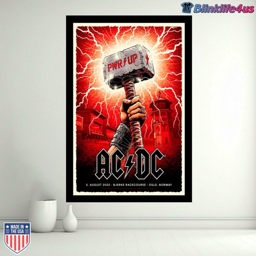 Some concert posters shout. Some scream. But the AC/DC “Power Up” Tour 2025 Oslo poster doesn’t just speak—it slams down like a thunderous hammer, shaking the ground and igniting the sky.