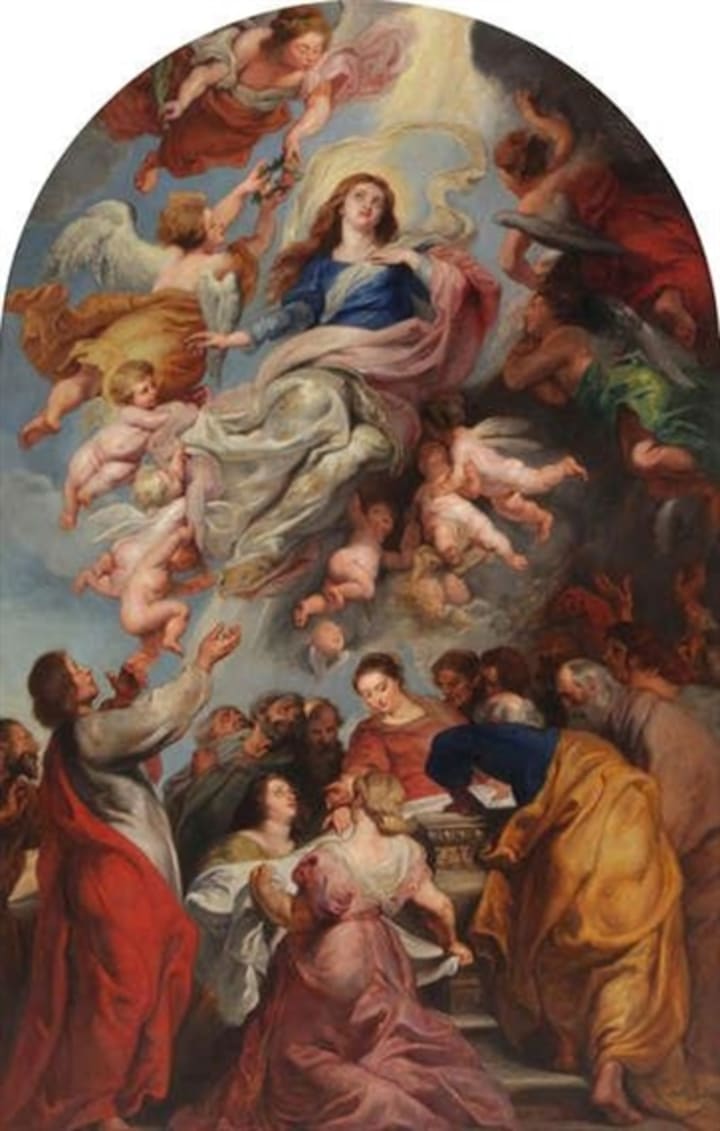 Assumption of the Virgin Mary is a painting commissioned to decorate the high altar at the Cathedral of Our Lady in Antwerp. The painting depicts the Virgin Mary lifted by a choir of angels. The painting today hangs in the same position as when it was done in 1626.