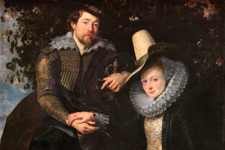 Honeysuckle Bower is a painting that the artist created after returning from Italy in 1609. That year he married the daughter of an important figure in Antwerp, Isabella Brant. The painting depicts the couple surrounded by marriage symbols, like holding their right hands. Being a symbol of love, they sit in a bower of honeysuckle.
