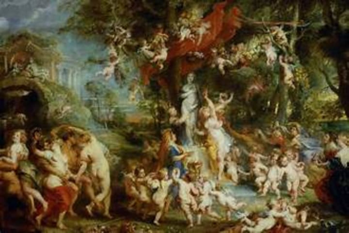 The Garden of Love is a painting depicting an over-the-top garden party emphasizing the grandeur and splendor of the people shown on canvas with various allegories and symbolism.