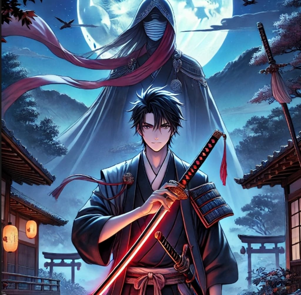 One night, while Ryoma was training alone under the moonlight, he suddenly felt a cold breeze blowing around him, and he sensed a strange presence. When he raised his head, he saw a transparent entity glowing crimson in front of him, standing a few steps away from him. The entity looked like an ancient samurai warrior, covered in traditional armor, and its eyes glowed a calm red.