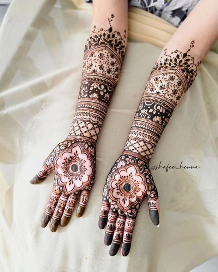 A trending style, this design utilizes empty spaces strategically to create a balanced, artistic effect. It’s perfect for those who love modern and stylish henna patterns.