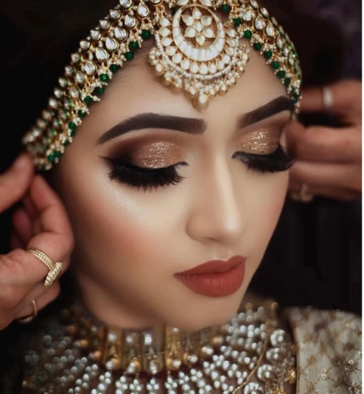 Gold never goes out of style when it comes to bridal looks. Perfect for Indian and traditional weddings, golden shimmer eyeshadow paired with winged eyeliner creates a radiant and royal look. This style complements red, maroon, and pastel bridal outfits beautifully.