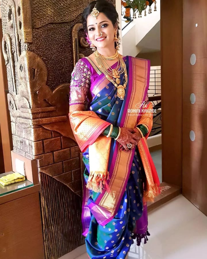 Maharashtrian Bride: The Maharashtrian bride is a vision of grace in a nauvari saree (nine-yard saree) draped in a dhoti style. She wears traditional gold jewelry, including the Mundavalya (a string of pearls tied across the forehead), Nath (crescent-shaped nose ring), and green glass bangles, which symbolize prosperity. Simplicity and elegance define her look.
