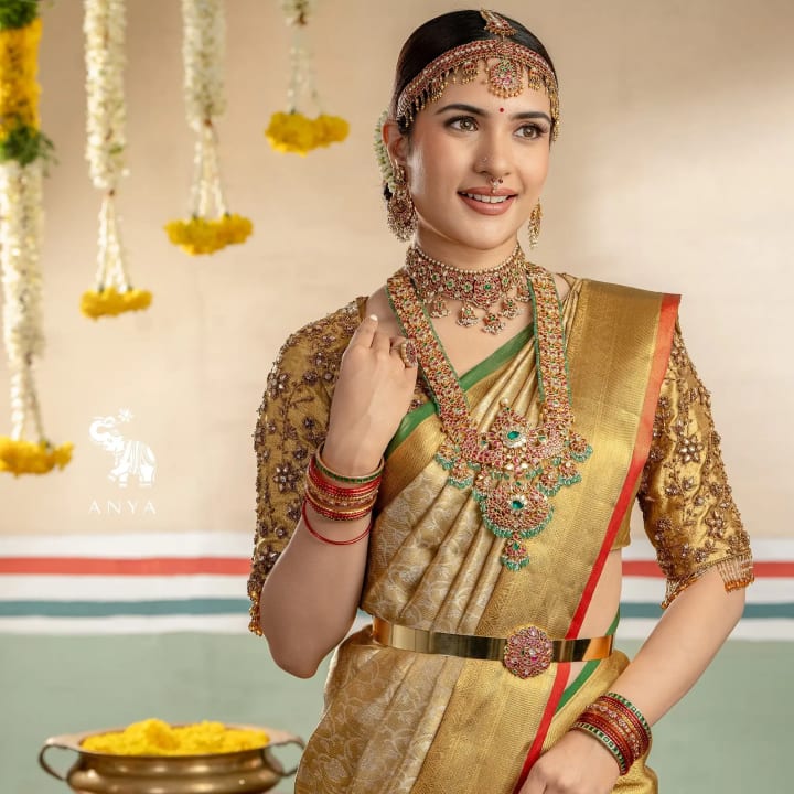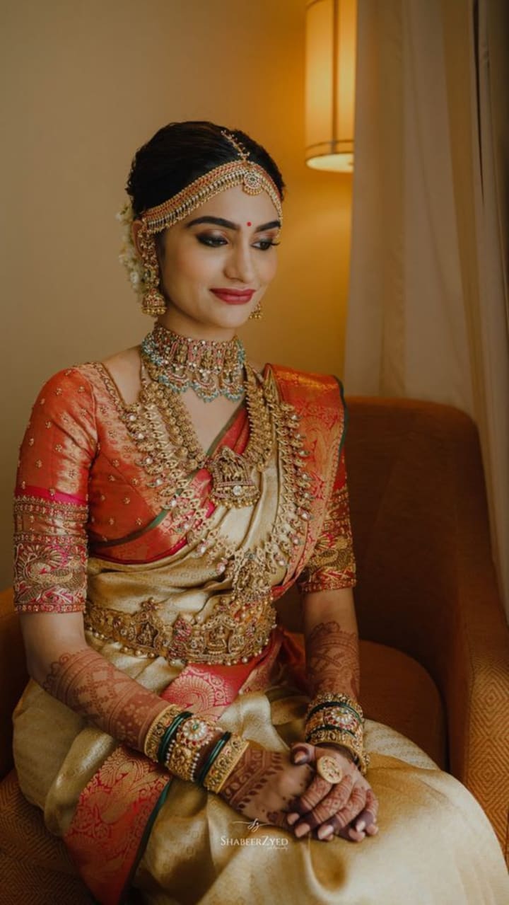 Telugu Bride: The Telugu bride dazzles in a vibrant silk saree, adorned with layers of gold jewelry, including the Vaddanam (gold waist belt) and a long braid decorated with flowers. Her bridal makeup is soft yet radiant, complementing her traditional gold accessories.