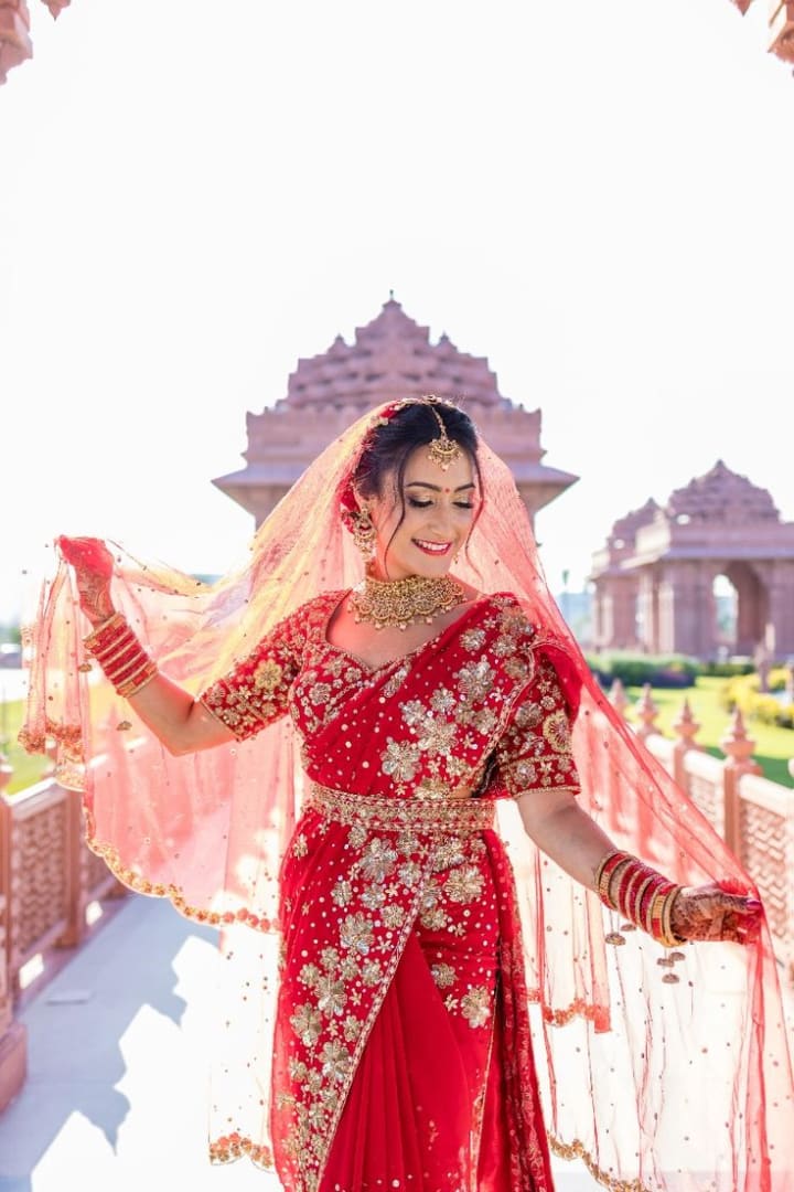 Punjabi Bride: Punjabi brides exude vibrancy with their red or maroon lehengas, heavily embroidered with zari and sequins. They accessorize with a dazzling set of jewelry, including chooda (red and white bangles), kaleeras (dangling ornaments), and a matha patti (headpiece). Their bridal look is incomplete without bold makeup and a radiant glow.