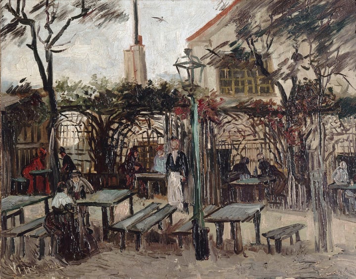 Dutch post-Impressionist artist Vincent van Gogh created this painting in 1886. It depicts a quaint-looking café terrace. A waiter is front and center ready to serve.