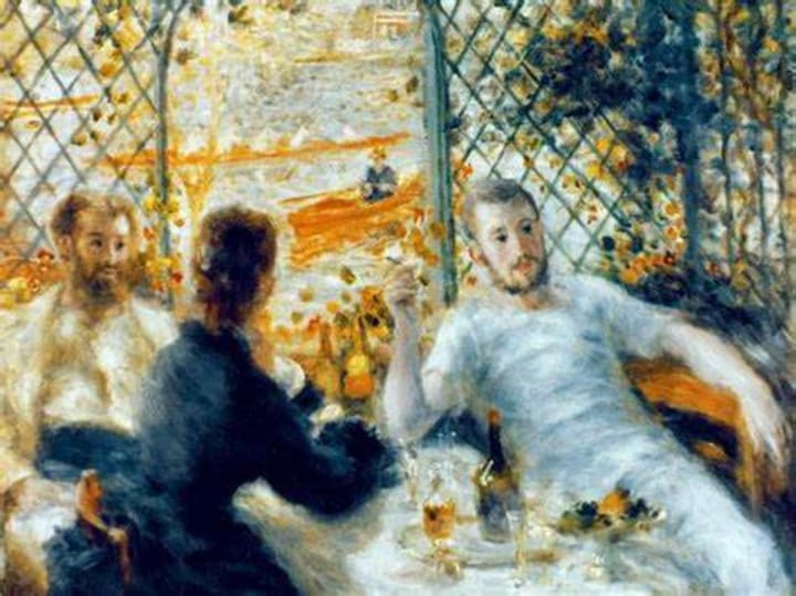 French artist Pierre-August Renoir created this painting in 1875. It depicts three people having lunch at the Maison Fournaise in Ile des Impressionistes by the Seine River near Chatou, west of Paris, France. Out the window of the restaurant, a man is seen in a canoe paddling along the river. This artwork can be seen at the Art Institute of Chicago in Chicago, Illinois in the US.