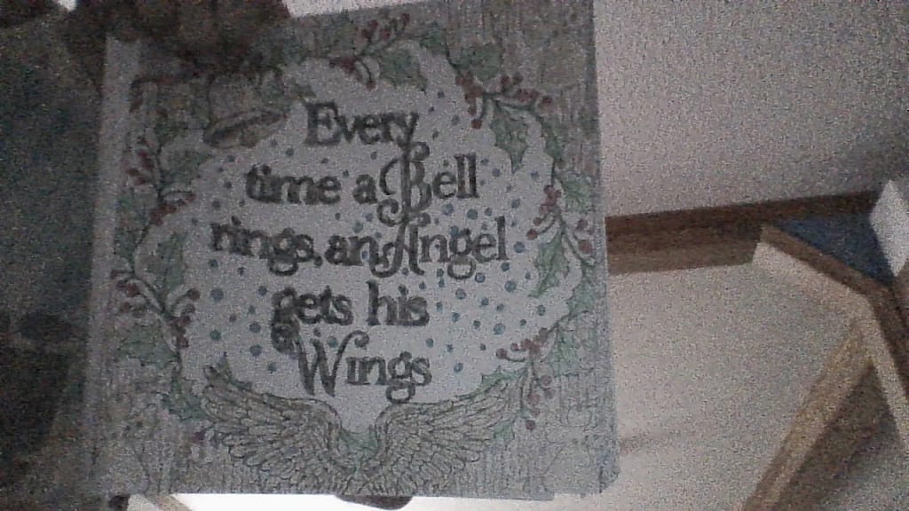 If you have seen the movie 'It's a Wonderful Life' you have heard this quote many times. Every year I watch this movie and hear JuJu, George Bailey's youngest child, say this line for it brings a smile to my face every time I hear it. This is another Christmas picture that I used crayon with reds, greens, and gold for the main picture red for the berries and ribbon and gold for the bell and wings and green for the holly leaves and the wreath. I used brown and black for the border that I think is a wall and black for the words of the quote.