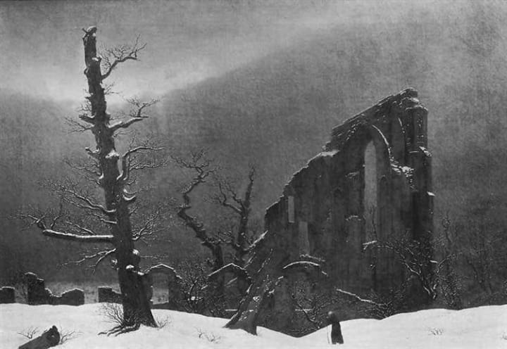 German Romantic landscape artist Caspar David Friedrich is remembered as one of the most famous landscape artists in history. This artwork was created in 1811 and is among his most famous paintings. The painting depicts a heavy blanket of snow with dark clouds swirling overhead. All around is a stark barren winter landscape.