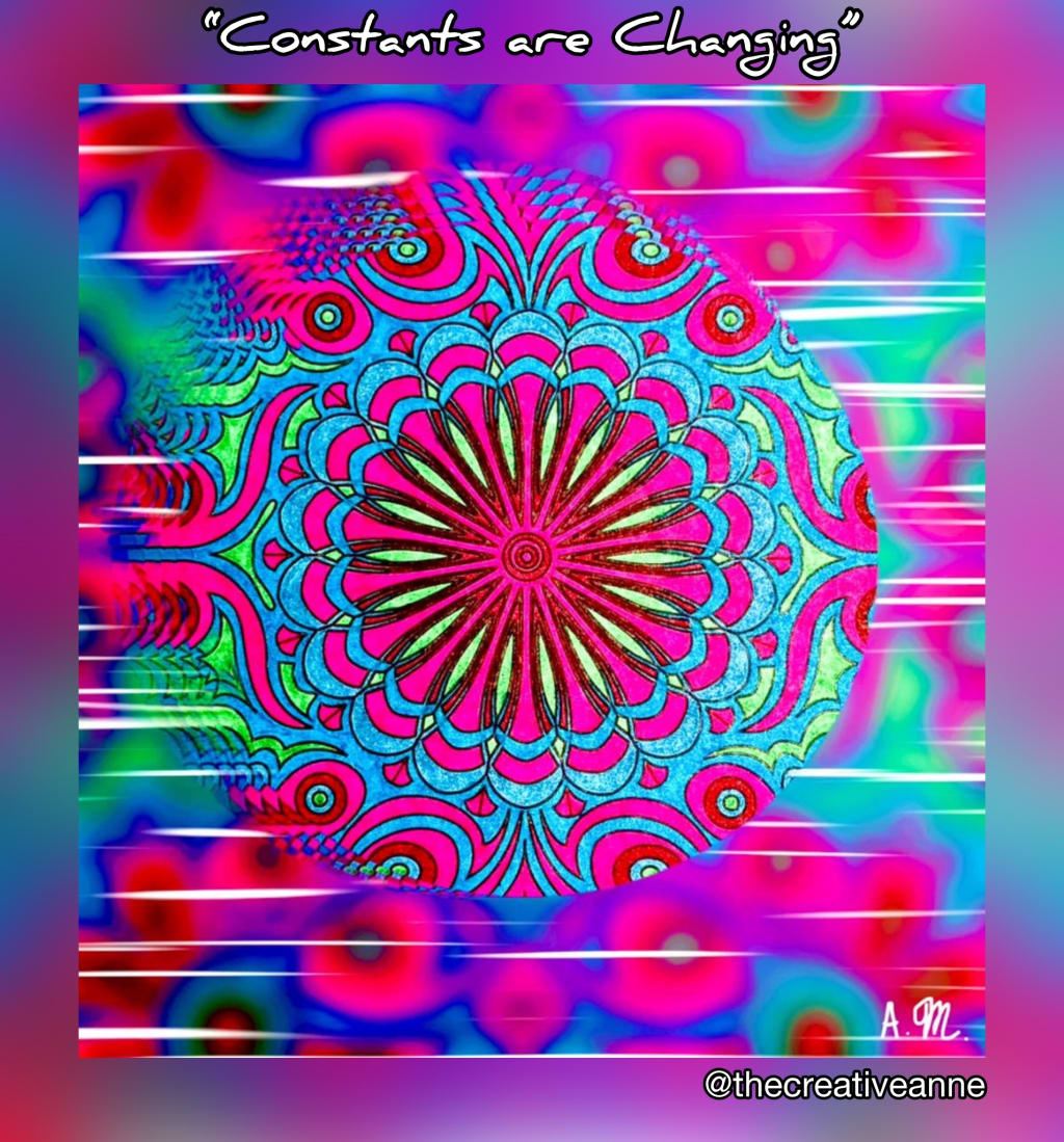 Ultimately, "Constants Are Changing" is an invitation to the viewer to find their own inner mandala—a place of stillness and order that can withstand the external chaos. In a world where every "constant" seems to be in flux—from social norms to technological advancements—the piece serves as a reminder that true stability is not found in the external world but within ourselves. The vibrancy and energy of the artwork are not meant to be frightening but rather to convey the exhilarating and powerful nature of living in a time of rapid transformation.
