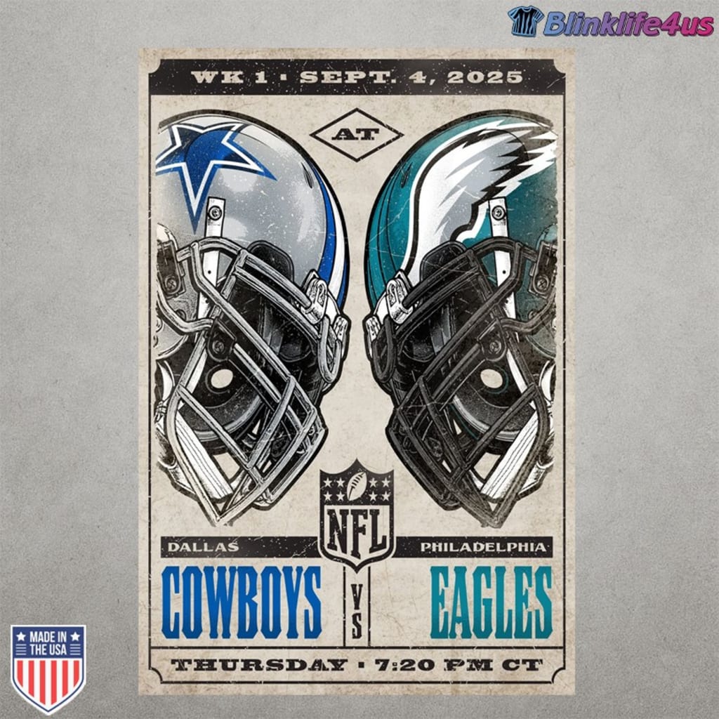 When sports and art collide, the result can be something truly powerful. The Dallas Cowboys vs Philadelphia Eagles 2025 Poster, designed for Week 1 of the NFL season on September 4, 2025, captures that exact fusion. With its gritty, vintage aesthetic and bold football symbolism, this artwork stands out as both a keepsake and a statement. It’s more than just a game-day announcement—it’s a piece of visual history that reflects the fierce rivalry between two of the NFL’s most iconic franchises.