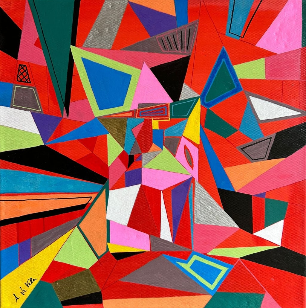 Earth on Fire is an oil painting on canvas, measuring 40 cm by 40 cm. Its vibrant, almost chaotic composition mirrors the alarming state of our environment. Fiery reds dominate the canvas, interspersed with cooler blues and greens, which represent the earth’s diminishing balance. Geometric shapes crisscross the surface, evoking the complex interplay between natural forces and human intervention.