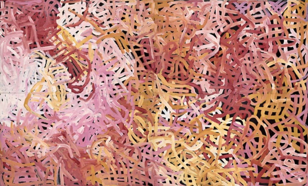 Later, her brushstrokes grew freer, bolder, and more dynamic. Works like Big Yam Dreaming, a monumental black-and-white painting, epitomize her later style, where the canvas becomes a pulsating map of interconnected roots, pathways, and energies. Her final years saw her experimenting with expansive color palettes, layering vibrant reds, yellows, purples, and whites to capture the essence of her environment in a way that feels both cosmic and deeply personal.