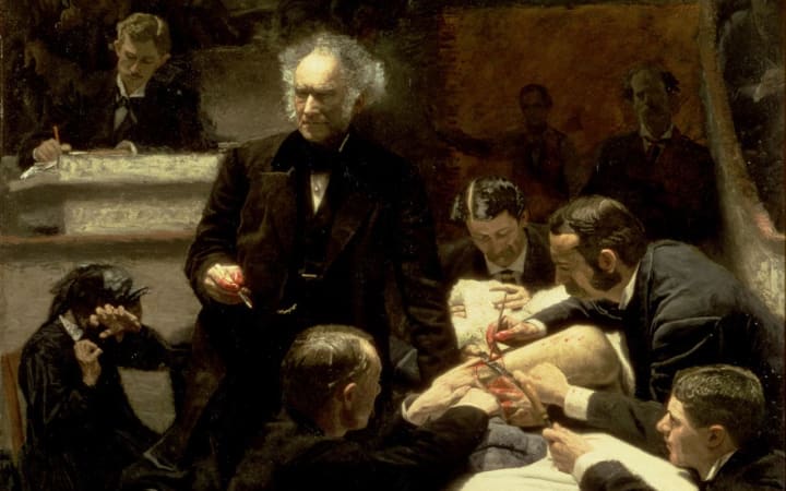 American artist Thomas Eakins created this painting depicting a class held by Dr. Samuel D. Gross at the Jefferson Medical College in Philadelphia, Pennsylvania. It became the most important American scientific realism painting ever created. The painting shows an actual operation in a surgical theater during the 1860s.