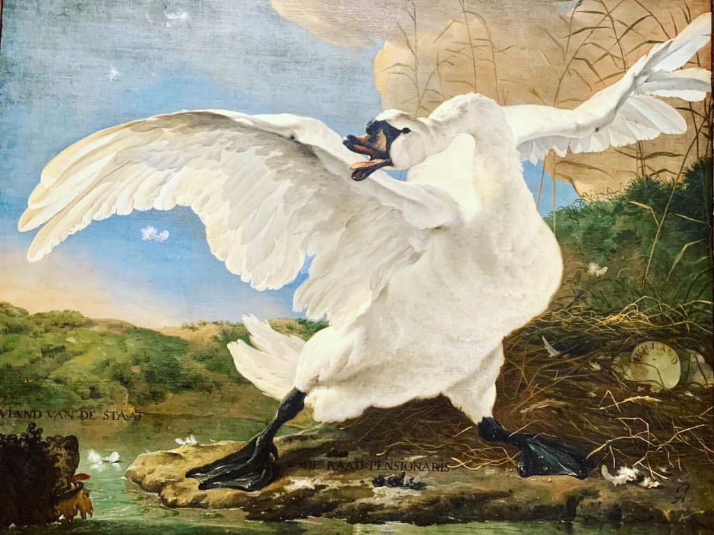 Dutch Golden Age artist Jan Asselijn was renowned for his bird paintings. His best known is this artwork depicting a true to life swan. The swan appears threatened and protecting itself.