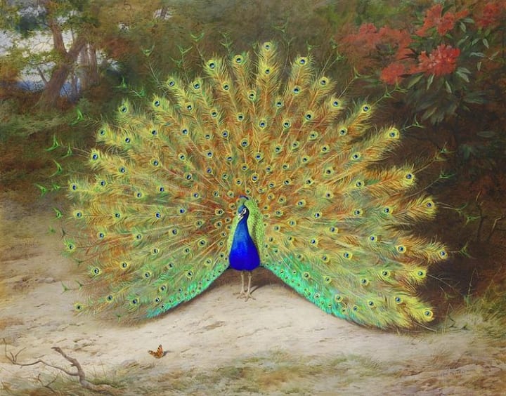 Scottish artist Archibald Thorburn was one of the most famous painters of wildlife focusing on birds. He was the Vice President of the Royal Society for the Protection of Birds. He would visit the forests for inspiration and to observe birds. This artwork is one of his most famous bird paintings. It depicts a magnificent peacok fanning his tail. The colors are vibrant shades of blue, green, and red around the top half of the painting.